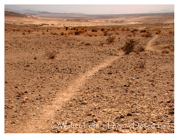 Indian Trails![]() Travelers packed everything on their backs, and wore any kind of foot gear. Children always wore shoes; if the children were too small to walk, their parents took turns carrying them. They also took turns packing the water jar, which was carried in a burden basket (ais) or a net. Blankets, etc., were taken. Women took cooking utensils, including manos, but not metates. Men took weapons and walked ahead. Dogs accompanied the party. Children were given something to carry; perhaps a small skin sack, but not a burden basket or net. Travel along certain routes had to be timed so that people could be sure that there would be water available in drier sections. Timing was particularly important if some of these sources were tanks and sandstone potholes. from: Southern Paiute – Chemehuevi Trails Across the Mojave Desert: Isabel Kelly's Data, 1932-33 (Darling/Sneed Symposium, AAA 2004) Catherine S. Fowler - University of Nevada, Reno |