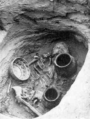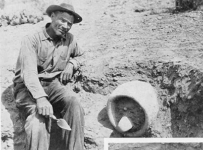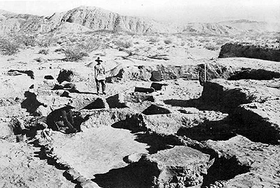 Lost CityBurrowing into the sandhills of Southern Nevada, archeologists have uncovered the homes and utensils of a thriving Indian civilization which existed 300 or 400 years before Columbus discovered America. Now the rising waters of Lake Mead are about to submerge the Lost City and remove it permanently from the field of research. But in the meantime the men of science have uncovered a wealth of interesting facts about these ancient tribesmen. The highlights of their discoveries are presented in this story by Johns Harrington, son of the archeologist in charge of the excavations. Lost City of the Ancients to Vanish Again in Lake Meadby Johns HarringtonDesert Magazine - December, 1937 ARROW-MAKER sat down on a boulder and looked to the east across the Valley of the Lost City where the pueblos of his people dimly were outlined in the distance. Lizard-Digger, the Indian's lean dog. whined. He wanted to go home. They had been away for nearly a week. They had gone to Atlatl rock in the nearby Valley of Fire where his master had been praying to the Rain and Thunder Spirits, and writing picture messages to the tribal deities on the canyon walls. Lizard-Digger had caught rabbits and other small creatures for food. Arrow- Maker had fasted to make his prayers more acceptable to the Gods. When he returned he would take part in the rituals to be held in the circular underground rooms—the kivas. Sand-paintings of clouds and lightning, and stones bearing the painted emblems of fertile crops, would surround the altars. Arrow-Maker's people lived in onestory houses of stone and adobe, scattered along the foothills on either side of the valley for a distance of five miles. Many of the tribesmen were wealthy and the members of their clans were grouped together in apartment-like structures built around circular courts, some containing as many as 100 rooms. Mesquite, willow, arrowweed and salt bushes covered this Nevada vallev save where the Indians had cleared the land to grow cotton, corn, beans and squash. Meandering along the length of the valley was a sluggish river, checked by an occasional brush dam built for irrigation purposes. These dams were made by driving stakes into the mud of the river bottom, then piling brush on the up-river side. Rocks weighted down the brush and the level of the water was raised enough to start small streams flowing along irrigation ditches. Primitive Tools UsedArrow-Maker recalled how difficult it was to rebuild the irrigation systems every spring after the winter floods had destroyed those of the previous year. The dams were easy enough to replace, but excavation work for the ditches was not so simple. It was necessary to loosen the ground with digging sticks, then transfer it laboriously with tortoise-shell scoops into large baskets to be carried away.The Indian youth and his dog resumed their journey. As they approached the pueblos the trail sometimes crossed the irrigation canals and ran through fields of maize, with bean vines clinging to the corn stalks. They passed little patches of cotton and squash along the way. Arrow-Maker soon reached his home, the house of his mother, for among these people it was customary for the women to own the property. Arrow- Maker's father was head of one of the religious societies, and was therefore a member of the governing council of the village. The pueblo people of that period probably had no civil government— for it should be known that the scene presented here is the archeologist's concept of a civilization which existed approximately 800 A.D. "Is there food in our house for your famished son?" asked the Indian youth as he greeted his mother. "Yes, my son. Your brother has returned from the hills with the meat of deer and mountain sheep. There will be feasting in our house for many days." Among the tribes of the Valley of the Lost City the men not only were hunters, but they built the dwelling houses, planted and watered the fields, and spun and wove the cotton. The women prepared the food and made pottery and baskets. They also dressed the skins and gathered the natural food supply from mesquite trees and the native grasses. "Where is our father?" asked Arrow- Maker a little later when he entered the courtyard and saw his sister, Basket- Woman, grinding meal in the shade of a brush shelter within the circular enclosure. "He has gone to the salt mines where the small river joins the big one," she replied. "Others went with him as they have need of much salt. Traders from the tribes beyond the western mountains near the great water have brought elkhorns and abalone and olivella shells to exchange for our salt." Crude was the mining of those Indians who lived in the Nevada desert three or four centuries before Columbus discovered the Americas, but effective none the less. Torches made with bark and arrowweed and fine sticks lighted the salt caverns. Notched stone hammers attached to wooden handles were used to break down the white crystals from the cavern walls. Basket-Woman was dressed in the garb of the tribe. A dress woven of cotton and dyed a purplish color reached her knees, and around her waist was a cotton belt with designs of red and black. Her hair was tied in two knots, one on each side of her head. The pre-historic dwellers of Lost City were short of stature and slender, with round heads and long black hair. Both men and women wore fiber sandals. The men probably picked out their sparse beards one bristle at a time, and accepted the pain with the stoicism of their race. Arrow-Maker wore a white cotton breech clout, or sometimes a kilt. Both were held in place with a waist cord made up of many cotton strings loosely twisted together. He wore a headband similar to his sister's belt, but narrower, with a fringe on its lower edge Blankets of cotton or woven of furry strips of rabbit skin were used for additional covering during cold weather. A daughter-in-law of the clan entered the courtyard as Arrow-Maker was talk