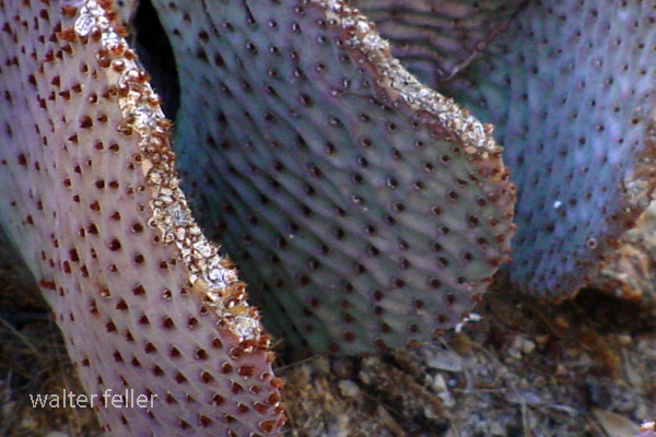 Beavertail CactusOpuntia basilaris![]() Flat green to purplish heart-shaped pads, spineless but with numerous bristles (glochids). Two to three inch wide magenta flowers cluster at top of pads in March through June. Pads appear wrinkled in drought conditions. Grows on rocky slopes up to about 6,000 feet elevation.