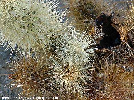 Teddy-Bear Cholla CactusCylindropuntia bigelovii (Engelm.) F.M. KnuthSynonym: Opuntia bigelovii var. bigelovii) ![]() Also known as Jumping cholla. Usually grows to 3-4 feet tall, sometimes as tall as 6 feet. Tree-like overall appearance. Stems are densely covered with extremely sharp, one inch long spines. Yellow flowers bloom in April. Seeds are usually sterile however the plant typically propagates from fallen joints. |