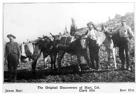 On December 19, 1907, Jim Hart, with Bert and Clark Hitt, discovered gold, soon transforming a corner of the eastern Mojave into the thriving town of Hart. By January there was a "stampede to Hart" with people leaving Needles and Searchlight "in automobiles, buggies, wagons and on bicycles and burros." Many men came from Goldfield, Nevada. By the end of the month, telephone wires that connected with the Western Union at Barnwell had been strung up, and an estimated 200 men were in camp, working leases on the claims that had been staked. 184