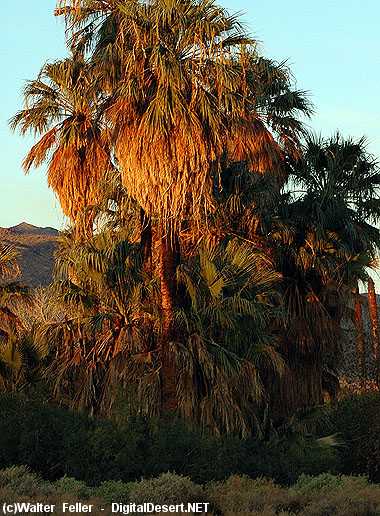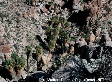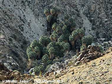Fan Palm OasisAll natural or naturalized plant assemblages that include California fan palms are recognized as Palm Oasis habitats, cultivated stands of California fan palm are not considered Palm Oasis habitats. Densities of California fan palms vary from sparse scattered trees to dense, closely packed individuals. The vertical structure is usually well storied with fan palms towering over a subcanopy of smaller trees and large shrubs. California fan palms reach a maximum height of 25 m (82 ft). Grasses and shrubs may be found under relatively open canopies, although large stands generally have a sparse understory.Composition California fan palm is the dominant species in the canopy. Occasionally, fan palms are associated with coyote willow, velvet ash, California sycamore, and naturalized date palms. Fremont cottonwood, mesquite, and tamarisk may also be present. Subcanopy plants include arrowweed, squaw waterweed, alkali goldenbush, and young individuals of species in the overstory. Forbs and grasses include alkali sacaton and wiregrass. Habitat Stages Vegetation Changes California fan palms grow from seedling stage through young palm stage to mature trees. Only mature trees can reproduce. Most mature Palm Oasis habitats exhibit a relatively open canopy. Successful reproduction occurs after very wet winters. This response results in the "even aged" character of many palm oases. Reproduction may need to occur only once every 100 years in order to perpetuate Palm Oasis habitats. Duration of Stages The duration that a palm oasis persists as a particular successional stage is not clearly known, but seems to depend on the severity or frequency of fire. Fire is important for the reproduction and maintenance of Palm Oasis habitats Fire opens up the understory, permitting fire-tolerant fan palms to become established. In addition, fire kills intolerant plants, such as mesquite, enhancing the water supply and releasing established shade-intolerant fan palms. As a result, palms grow very rapidly. Palm Oasis habitats are relatively long-lived; individuals may live for 200 years, though most probably die by year 150. Most oases exist as a mature stage often associated with a dense understory of younger palms. Biological Setting Habitat Palm Oasis habitats are found adjacent to a number of other desert habitats including: In many cases, characteristic plant species from these habitats comprise the understory of palm oases. Wildlife Considerations Many wildlife species (e.g., Gambel's quail, mourning dove, bighorn sheep) are attracted to Palm Oasis habitats because of the permanent or nearly permanent water supply. Further, the additional foliage complexity of tall trees with broad-leafed, dense canopies provides habitat not normally found in the short, shrubby creosotebush assemblages that dominate southeastern California. Species such as hooded oriole are partial to palms for nesting. Physical Setting Palms are restricted to areas with permanent water or a water table that approaches the ground surface. Thus, Palm Oasis habitats generally occupy sites with moist alkaline soils near seeps, springs, and streams. The largest fan palm groves are along permanent streams or at large springs. Palm Oasis habitats are also found on hillsides or in canyons, arroyos, or washes. Many sites are adjacent to faulting activity, especially along the San Andreas Fault, where underground water frequently emerges. Hot, dry summers and cool, moist winters are characteristic. Summer temperatures are warm to hot. At the Oasis of Mara, mean temperatures for June through September range from 28 to 32 C (82 to 90 F). On only 29 days of the year does the temperature drop below 0 C (32 F). Precipitation generally occurs in winter, though summer storms originating in the Gulf of California may result in precipitation. Rainfall ranges from 8 to 15 cm (3 to 6 in per year. Potential evapotranspiration exceeds precipitation by 10 to 15 times.
