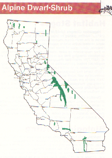 Ecosystems & Habitats: Shrub Dominated Wildlife Habitats Alpine Dwarf-Shrub (ADS) Oceanspray, Greene Goldenweed, Mountain Heather Vegetation Structure--Alpine Dwarf-Shrub habitats typically are low graminoid and forb communities with an admixture of dwarf-shrubs (often cushion plants) (Kuchler 1977). The perennial herbs or dwarf shrubs comprising these communities are usually less than 0.5 m (18 in) tall (Cheatham and Haller 1975). Coverage may reach 100 percent at lower elevations but becomes increasingly open as elevation increases. On mesic sites, a continuous turf contrasts with patches of bunchgrasses and cushion plants on drier sites (Kuchler 1977). Composition-- Species composition varies considerably throughout California. The most common shrubs occurring are creambush oceanspray, Greene goldenweed and mountain white heather. These shrubs occur primarily in northern California and the Sierra Nevada. Creambush oceanspray also occurs commonly in the southern California mountains. The most common alpine shrub in the White Mountains is timberline sagebrush (Parker and Matyas 1981, Cheatham and Haller 1975). Nonshrub species that commonly occur in the alpine areas of northern California and the Sierra Nevada include Eschscholtz buttercup, primrose, prostrate sibbaldia, sedge, bluegrass, buckwheat, squirreltail, rock-cress, mountain sorrel, pussypaws, Indian paintbrush, Payson's draba, and Sitka romanzoffia (Parker and Matyas 1981, Cheatham and Haller 1975). The following nonshrub species dominate the high Sierra: columbine, heart willowweed, Davidson's penstemon, Jacobs-ladder, and Coville phlox (Parker and Matyas 1981, Cheatham and Haller 1975). The scattered alpine areas of the San Bernardino, San Gabriel and San Jacinto mountains are dominated by draba, Parish's alumroot, creambush oceanspray, silver raillardella, alpine Eschscholtz buttercup, wild onion, rock-cress, mariposa lily, and several species of buckwheat (Parker and Matyas 1981, Cheatham and Haller 1975). The dominant nonshrub species in alpine areas of the White Mountains include timberline sagebrush, Scribner wheatgrass, several species of phlox, and Jacobs-ladder (Cheatham and Haller 1975). Other Classifications-- Other names for Alpine Dwarf-Shrub habitat include Dwarf Scrub (Alpine) Series (Parker and Matyas 1981), Alpine Community (Küchler 1977), Alpine fell-field (Munz and Keck 1959) and Alpine fell-field cushion type (Thorne 1976). This habitat is included in Cheatham and Haller's Alpine Fellfields major subdivision under their Alpine Boulder and Rock Field habitat type. Cheatham and Haller (1975) further subdivide Alpine Fell-fields into 1) Klamath-Cascade, 2) Sierra Nevada, 3) Southern California, and 4) White Mountains Fell-fields. Habitat Stages Vegetation Changes-- 1:24,S-M. Following disturbance, Alpine Dwarf-Shrub habitats follow a slow successional process to any of the structural classes 1;2-4;S-M. There is limited information about the changes that occur in the plant communities comprising this habitat. Only limited autecological studies have been conducted (Mooney 1966, Billings and Mooney 1968, Billings 1975 Chabot and Billings 1972, Schultze et al. 1967(Schultze or Schulze listed as Schulze in Lit Cite), Johnson and Caldwell 1975, Ehleringer and Miller 1975), but insufficient comprehensive synecological work has been conducted to effectively describe the various successional stages and associated species in this habitat. Major and Taylor (1977) present an excellent review of the work on floristics and autecology of alpine communities. Duration of Stages-- Development of communities in this habitat proceeds quite slowly and does not attain great stature or complicated structure due to the harsh environmental conditions. The time required to proceed through the few successional stages is not known, but is dependent on the severity of the local environmental and soil conditions. Presumably, the structure and composition of the climax communities do not change substantially over time. Severe changes in weather patterns extended drought, for example or other environmental conditions landslide, mass-wasting, and destructive activities of animals or man usually result in the communities of this habitat reverting to earlier successional stages. Biological Setting Habitat-- The Alpine Dwarf-Shrub habitat is restricted to the highest elevations generally above timberline. At the lower elevational extent of this habitat, it normally interfaces with 1 ) Subalpine Conifer (SCN) and closed cone pine/cypress (CPC) habitats, 2) Subalpine Forest or Foxtail Pine Forest in the north, 3) Sierran Mixed Subalpine Forest in the Sierra Nevada, 4) Southern California Subalpine Forest and 5) Bristlecone Pine Forest in the White Mountains. The Alpine Dwarf-Shrub habitat vegetation may sometimes constitute part of the Bristlecone Pine Forest where they intergrade. The Alpine Dwarf-Shrub habitat often intergrades with Alpine Talus and Scree Slopes in the summit regions of southern California mountains. This habitat also intergrades quite broadly with Subalpine Sagebrush in the White Mountains (Cheatham and Haller 1975). Wildlife Considerations-- Birds common in this habitat (or adjacent alpine meadows) include blue grouse, rufous hummingbird, mountain bluebird and gray-crowned rosy finch. Mammals in this habitat include the Mount Lyell shrew, broad-footed mole, pika, white-tailed jackrabbit, yellow-bellied marmot, Belding's ground squirrel, northern pocket gopher or mountain pocket gopher, and mountain sheep (Storer and Usinger 1963). Physical Setting Generally, the Alpine Dwarf-Shrub habitat is found above timberline on all aspects, slopes, and ridge lines, so the physical environment tends to be cold, dry, and windy. In the northern portion of California, this habitat is cold with a brief summer growing season. This habitat is subject to intense solar radiation and freezing nights in summer. It is subject to severe winds and v
