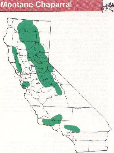 Montane chaparral is associated with mountainous terrain from mid to high elevation at 914 to 3047 m (3000-10,000 ft). It occurs in southern California above 2134 m (7000 ft) in the Transverse Range of Los Angeles, and in San Bernardino, Riverside and San Diego counties; from Siskiyou to Kern counties in the Cascade and Sierra Nevada mountains; as a minor type from Tehama to Lake counties; and in Del Norte, Siskiyou, Trinity, and Shasta counties in the North Coast Ranges and Klamath mountains (Barbour and Major 1977). As a successional stage following disturbance, its distribution coincides with the ponderosa pine and mixed coniferous forest habitat types (Barbour and Major 1977).