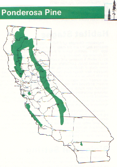 Habitat-- In Northern California, ponderosa pine stands occur above coastal oak woodland, valley oak woodland, blue oak woodland, blue oak-digger pine and below mixed conifer. Montane hardwood stands may be below or interspersed with ponderosa pine. Jeffrey pine stands often occur above ponderosa pine, but may be found on serpentine soils or on harsh sites at lower elevations in the ponderosa pine zone. Farther south, coastal scrub, chamise-redshank, mixed chaparral, or woodland oaks are typical at the lower boundary of the ponderosa pine habitat, with bigcone Douglas-fir or true firs at the upper edge. Dry, rocky sites within the habitat may support montane chaparral, mixed hard wood-conifer or closed-cone pine-cypress. Isolated, small patches of bigcone Douglas-fir may occur in mesic canyons or on north-facing slopes within ponderosa pine stands.