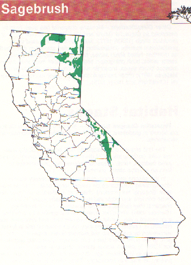 Ecosystems & Habitats: Shrub Dominated Wildlife Habitats Sagebrush (SGB) Sagebrush Species, Rabbitbrush Species, Horsebrush Vegetation Structure-- Sagebrush stands are typically large, open, discontinuous stands of big sagebrush of fairly uniform height. Big sagebrush tends to have a single short, thick, stem that branches into a nearly globular crown. Plant heights range from 0.5 to 3 m (1.6 to 9.8 ft) and density ranges from very open, widely spaced, small plants to large, closely spaced plants with canopies touching. In addition to a deep root system, big sagebrush has a well developed system of lateral roots near the soil surface. Consequently, the plants almost completely use the edaphic potential of a site, excluding most other plants in an area up to three times their crown area. This produces stands with shrubs of very uniform size and spacing. Sagebrush is often mixed with other species of shrubs of similar form and growth habit. In better sites, sagebrush stands have an understory of perennial grasses and forbs. At higher elevations, big sagebrush occurs as an understory in conifer stands. Composition-- Often the habitat is composed of pure stands of big sagebrush, but many stands include other species of sagebrush, rabbitbrush, horsebrush, gooseberry, western chokecherry, curlleaf mountain mahogany, and bitterbrush. Munz (1959)(No Munz 1959 in Habitat Lit Cite. I put Munz and Keck 1959 in Lit Cite at end.) lists 15 species and 6 subspecies of sagebrush as occurring in California. The subspecies differences are manifested in minor morphological and adaptive characteristics. As topography, soil composition, and moisture change through the sagebrush type, the dominant species of sagebrush changes. On low flats with shallow soils and restricted drainage low sagebrush is dominant. Where the soil remains saturated through the spring, silver sagebrush dominates. Black sagebrush dominates sites with soils high in gravel and carbonates. In communities not fully occupied by sagebrush, various amounts of herbaceous understory are found. Idaho fescue, bluebunch wheatgrass, several species of needlegrass, squirreltail, Sandberg bluegrass, and Great Basin wildrye are among the more common grasses found in the habitat. After disturbance and during years with excess moisture, annual grasses such as cheatgrass and medusahead invade sagebrush stands. At higher elevations sagebrush occurs as an understory with mountain mahogany, pinyon, juniper, and ponderosa pine. Other Classifications-- This type coincides fairly well with the Sagebrush Scrub plant community described by Munz and Keck (1970)(No Munz and Keck 1970 in Habitat Lit Cite. I put Munz and Keck 1973 in Lit cite at end.). Young et al. (1977) include all but the highest elevations of the habitat in their description of the Sagebrush Steppe. It combines the Sagebrush Steppe, Juniper Shrub Savanna, and the Blackbrush Scrub types of Küchler (1977) and the Sagebrush, Basin Sagebrush, and Blackbrush types of Parker and Matyas (1979) . Habitat Stages Vegetation Changes-- 1;24:S-D. The sagebrush habitat can exist in any of the structural stages. The most common disturbance factors are wildfire, prescribed burning, seeding to grasses, livestock grazing, and defoliation by larvae of the sagebrush defoliator moth. Stable sagebrush habitats with little herbaceous understory are relatively fire resistant. However, stands subjected to heavy grazing are often invaded by annual grasses and are highly flammable. Stands killed or severely damaged by the larvae of the sagebrush defoliator moth are also subject to wildfire. The effects of fire in the sagebrush habitat have been well documented by several authors including Blaisdell (1953) and Young and Evans (1974). Big sagebrush does not sprout after burning but most of the other shrubs common to the type do. The result for as long as 20 years after fire may be a community dominated by rabbitbrush, horsebrush, and grasses. A very hot fire in a degraded site may result in a seral community dominated by annual grasses and forbs. Perennial bunchgrasses frequently survive fires and become dominant. Short-lived perennial grasses, such as bottlebrush squirreltail and Sandberg bluegrass, may be the next seral stage after disturbance, depending on conditions. Under protection or moderate grazing these seral communities are usually replaced by climax perennial bunchgrasses and open stands of sagebrush. Man has frequently changed succession in this habitat with prescribed burning or mechanical removal of sagebrush, followed by seeding of introduced bunchgrasses to improve the carrying capacity for livestock. Duration of Stages-- Sagebrush usually reaches a fairly stable dominance in 10 to 20 years after disturbance, with or without an understory of perennial bunchgrass. Sagebrush usually remains dominant indefinitely or until the next disturbance. Biological Setting Habitat-- Sagebrush occurs at a wide range of middle and high elevations. At lower elevations and on drier sites, it gives way to such species as saltbrush, greasewood, creosotebush, and winterfat. At mid-elevations and on more mesic sites the habitat meets bitterbrush, curlleaf mountain mahogany, and western serviceberry. At high elevations it intergrades with Ponderosa Pine (PPN) and even with Aspen (ASP) habitat types. Wildlife Considerations-- The Sagebrush type is very important to wildlife because it serves as habitat for some of the more important game animals and occupies such a vast area. It is a major winter-range type for migratory mule deer, and many herds summer in Sagebrush-Ponderosa Pine complexes at middle and high elevations. The sagebrush and its included Low Sagebrush and Bunchgrass types are the principal habitats for pronghorns. The sage grouse is dependent on various successional stages of the type all year. It is also occupied by jackrabbits, cottontail rabbits, ground squirrels, least chipmunk, kangaroo rats, wood rats, pocket 