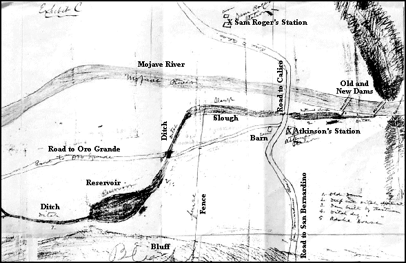 RIGHT PORTION OF THE SKETCH MAP FROM THE 1884 HARTMAN V ROGERS LAWSUIT. THE IDENTIFYING NAMES HAVE BEEN TYPED IN BECAUSE THE ORIGINAL SCRIPT IS HARD TO READ. THE ROAD HEADING NORTHERLY TO CALICO IS THE STODDARD WELLS ROUTE, WHICH CROSSED THE RIVER APPROXIMATELY AT TODAY'S INTERSECTION OF SIXTH AND D STREETS IN VICTORVILLE. REGRETTABLY THE SKETCH DOES NOT INCLUDE HUNTINGTON'S STATION. IT WAS NOT PART OF THE SUIT, BEING LOCATED ABOUT A MILE DOWNSTREAM OF ROGER'S STATION. REMNANTS OF THE DITCHES STILL EXIST, TRAVERSING WHAT WOULD LATER BECOME "OLD TOWN" AND CONTINUING ON DOWN PAST THE PRESENT-DAY CEMENT PLANT. OFF TO THE LEFT OF THE MAP, NOT SHOWN HERE, IS FARMLAND, SUCH AS CORN AND BARLEY FIELDS. < Previous - Next > |