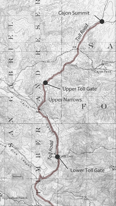 This road is twelve miles in length, crossing the entire range of the Sierra Nevada, and like all other mountain Roads is subject to damage by floods. The proprietor has spared no pains in keeping the Road in repair at all Seasons of the year. No Road in the State is kept in better condition.... Flooding problems revisited the pass in March 1869, when torrents of rain from a cloudburst did extensive damage to Brown's toll road. The road was impassable for heavily loaded wagons, and a large work crew was needed to restore it. The road crossed Cajon Creek about one-half mile above the lower narrows on what was then the site of the Faurot house (later called Bear Flat Ranch or Station, and now known as Cosy Dell). During the storm, three men attempted to cross the creek at this spot, but the flooding was so bad they lost their wagon and everything in it, their four horses drowned, and the men only narrowly escaped with their own lives. The destruction once again of his road must have made Brown feel the job he had taken on was next to impossible. But some of the travelers on the turnpike were unsympathetic to the problems he faced in maintaining it, and as the traffic on the road grew over the years, so did the protests about the condition in which it was kept. Historical accounts show that the trip over the toll road was difficult, to say the least. In 1865 Elliot Coues had traveled through Cajon Pass on a journey in which he retraced the route taken by Francisco Garces in 1775-76, and the data Coues gathered on the trip was later published in his book, On the Trail of a Spanish Pioneer. He described Brown's turnpike as a "narrow, deep and tortuous canyon, the roughest I have ever traversed on wheels; there was ten miles of this from the tollgate to Martin's ranch." Others were just as dissatisfied as Coues. In 1873, after receiving increasing complaints and a petition from teamsters objecting to the sorry state of the road, the Board of Supervisors agreed there was a need to address the problem, although no action was taken at that time. < Previous - Next > |