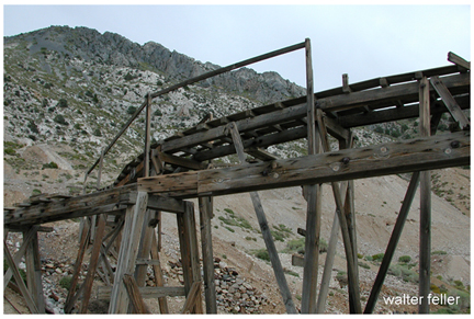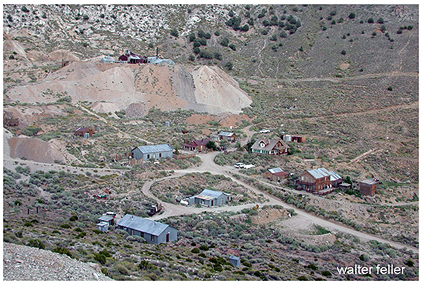 Cerro GordoCerro Gordo stands undisputedly as the Inyo County camp of greatest production, notwithstanding that no one knows, within some millions, what the total was. About $13,000,000 was the estimate at the close of its first period of life. The boom spirit of mining writers some twenty years ago raised the statement to $28,000,000, apparently just for the sound of it. The best available information is that the actual gross production of the camp's best days was approximately $17,000,000.Tradition long current in Inyo, and supported by pioneers of the old camp, has it that the first discovery was made by one Pablo Flores and two other Mexicans in 1865; that the companions of Flores were killed by Indians and that he was allowed to go after promising never to return. A letter written from the camp in 1868 said only that Flores had found some very rich float while traveling from the eastward with an Indian guide. Another version was current and believed in Virginia City, Nevada, at the time of Cerro Gordo's prosperity. It ran that a packer named Savariano, employed by a Comstock Mexican mine owner, ran away with a packtrain of forty mules laden with very rich ore. This he was supposed to take to Placerville for reduction, and he started according to program. When out of sight of his employer he headed south with the whole cavalcade. On this trip he was said to have found the Cerro Gordo mines. A Virginia paper said the absconding of Savariano was a matter of common knowledge. Be that as it may, the Flores version was accepted by Inyoites, including those who knew the old Mexican up to the time of his death near Owens Lake. Flores and a few companions were on the ground later in 1865 and located the Ygnacio, San Felipe and San Francisco claims. A small amount of ore was worked in the vesos, or crude furnaces. Their success brought a few Americans to the camp; the latter people made some locations, but did little or no work. The first sincere effort at development was made by a Mexican named Ochoa, who began work on a claim known as the San Lucas. He employed a few of his countrymen, and had the ore worked at the Silver Sprout mill, west of Independence. An increased number of miners came, and on April 5, 1866, Lone Pine district, including the new camp, was organized, with J. J. Moore as its Recorder. The first claim offered for record was the Jesus Maria. On January 1, 1870, 999 locations had been filed for record in the district. Among the early arrivals were M. W. Belshaw and A. B. Elder. After examination they left, but soon returned to begin development. Elder was succeeded by Victor Beaudry. Belshaw & Beaudry remained the bonanza firm of the hill; with them were associated Egbert Judson and others as parties in interest. To supply the water required for the camp Belshaw & Beaudry laid a pipe line, which froze and bursted the following winter, and was then replaced by a better system. The firm began acquiring control of "the hill," as the camp was generally called throughout the region. Among their purchases was a group of four claims for which they paid John B. White and P. Williams $20,000. Important ground adjoining the Union, one of their chief properties, remained independent, however, and under the same ownership as the Owens Lake Silver-Lead Company later became the basis of the suit which helped to check operations. C.F.R. Hahn, the mystery of whose loss has been mentioned in this record, was one of the discoverers of wholly new ground to the eastward of the main camp. W. L. Hunter, John Beveridge and others of honored Inyo memory were also among the owners in the eastern section. Two slagging furnaces, two blast furnaces, crusher, blower and other equipment were in use in the camp by 1870, all operated by steam and all well housed. In 1871 the use of slagging furnaces was done away with, decreasing expenses $50 a day at each furnace. Another improvement was the application of the water jacket, first devised and used by Belshaw. One of the first undertakings was a tollroad up from Owens Valley, a few miles distant. The road was held by Belshaw & Beaudry, though others assisted in its building for the benefit of their own properties. Those others found themselves on the same footing as strangers when it came to paying tolls. Their objections ended with complaints until 1871, when citizen John Simpson was arrested for misdemeanor in passing the tollgate without paying. To secure a jury used up venires amounting to ninety men ; the Justice court trial filled two days, and ended in a verdict of not guilty. A popular subscription was immediately raised and a free road was built to Cerro Gordo. The toll road went out of commission. Two stage companies ran daily conveyances from Lone Pine, every vehicle carrying full loads. A through-service line ran between Aurora, Nevada, and Cerro Gordo, charging $39 for the trip. When the not always dependable pipe lines were out of order, water was brought in on pack mules and sold at 10 cents per gallon for the small buyer and from 5 to S% cents for the wholesale consumer. The water bill of the American Hotel was $300 a month, and each furnace and the Union hoist ran at a daily expense of $120 for water. Fifty pack mules were busy in the water service. In 1872 Beaudry bought the San Lucia (or San Lucas) and added it to the syndicate's list. Eleven producing mines were being operated. In addition to the furnaces at the camp, ore was being smelted at the Owens Lake Silver-Lead company's plant at Swansea, at the lake. While the bulk of production came from ores of more moderate grade, values up to $800 or more per ton were too common to attract much attention. One of the mines counted rock carrying 180 ounces of silver as its second-class grade. Beaudry reported in 1872 that ''the mine" (probably the Union) was sending up 70 tons of ore each ten hours. He was about to increase his furnace capacity to ten tons of bullion daily. Each furnace was t