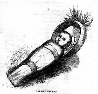 The Chemehuevis bind their infants to a board, and cover their heads with a cradle-like contrivance made of osiers. The hands are not confined, however, and the constraint does not seem irksome to the child. Partly to this practice may be ascribed & the erect and faultless forms for which the Colorado Indians are famous.