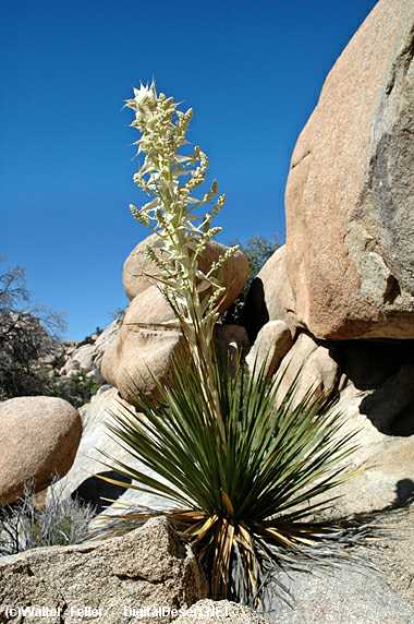 Xerophytes are plants that have developed special means of storing and conserving water. To reduce transpiration, direct cooling air flow, shade themselves, and/or reflect hot sunlight, they often have few leaves, or have spines, thorns, or hairs instead; in some cases they use only their green “skin” to perform photosynthesis. Some xerophytes have leaves that are tough and waxy or coated with shiny oils, which also cuts down on transpiration, or they have small, fluttery leaves that help to cool the plants. Some species have spongy, shallow roots to take advantage of even the smallest amounts of rain, plant tissues that can store large amounts of water for later use, or ribs that direct moisture to the plant’s roots. The Joshua tree (Yucca brevifolia), various types of cacti, and Mojave sage (Salvia mojavensis) are all examples of Mojave xerophytes.