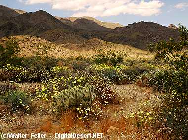 Desert perennials survive by remaining dormant during dry periods of the year, then “coming back to life” when water becomes available. For example, the ocotillo (Fouquieria splendens) grows leaves quickly after a rain to produce food through photosynthesis. In a few weeks, ocotillo flowers bloom, seeds ripen and fall, leaves drop, and the plant becomes dormant once more. Ocotillo stems also have a waxy coating to help conserve water during dormancy. Other perennials include brittlebush (Encelia farinosa), some varieties of California poppy (Eschscholzia californica), and desert paintbrush (Castilleja angustifolia), a parasitic plant that appropriates water from its host. By contrast, annuals, or ephemerals, germinate only after a heavy rain, and then complete their reproductive cycle very quickly to capitalize on optimal heat, light, and moisture conditions. They bloom profusely for a few days or weeks in the spring, and then die, leaving their drought-resistant seeds in the desert soils until the next spring rains. Annuals are responsible for the colorful desert wildflower displays that often appear in spring. Examples of such wildflowers are sand verbena (Abronia villosa), Mojave aster (Xylorhiza tortifolia), and dune evening primrose (Oenothera deltoides). Generally, thousands of annual and perennial seeds can be found in every handful of desert soil; the world record is over 200,000 seeds per square meter, though the Mojave’s soils contain far fewer.