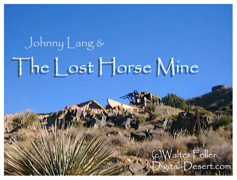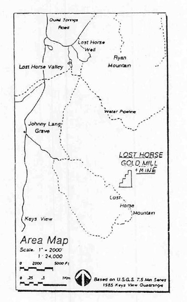 Prospectors & Miners Joshua Tree National Park Johnny LangJohnny Lang and the Lost Horse MineSome people and places become inextricably linked in history. One wouldn't be quite what it was without the other. In this case, the Lost Horse Mine may have been just another nondescript, yet productive mining operation, and Johnny Lang may have not become consumed with gold fever, ultimately dying alone and forgotten in the desert. Together, they create a story that will endure in the history of Joshua Tree National Park.The Lost Horse Mine After the placer deposits and gold mines of 1849 gold rush played out, prospectors turned to the California deserts to uncover more of the soft, yellow metal. The deserts provided an exceptionally tough environment to work in. Summers were hot, and resources such as water and wood for fuel were scarce. It was difficult and expensive to transport equipment and provisions to the mines. Sometimes there wasn't enough gold to make the efforts payoff. This was the case in many of the over 300 mines developed in what is now the park lands. The Lost Horse Mine became an exception by producing 10,000 ounces of gold and 16,000 ounces of silver (approximately $12 million in today's dollars) between the years 1894 and 1931. Johnny Lang John Lang was born in 1853 in Missouri. Working with his father as cattlemen, together they moved through Kansas, Texas, and New Mexico, finally ending up in California and the Los Angeles area. Seeing how important Los Angeles was to become, they threw in with some other cattlemen and purchased a grazing concession in Mexico. They began driving cattle to Los Angeles markets through Arizona and the Colorado Desert. In 1891 the Colorado River breached its banks and flowed into the Coachella Valley creating new grazing lands. Quick to see these new grasslands would save thousands of dollars in transport costs, they had moved their operation to Indio in 1893. The Lost Horses Johnny had been grazing a herd north of Indio. One morning a horse had wandered away. Johnny followed the tracks into the dry highlands of what is now known as the Lost Horse Valley. The tracks led him to the camp of the McHaney Gang. Jim McHaney and his band of no-accounts had the reputation of being cattle rustlers and horse thieves. Menacingly, Jim told Johnny that he didn't lose his horse, and he should move on. The Strike Prospectors had been finding gold near where the Lost Horse Mine was to be. If the McHaney Gang came across a lone prospector they would steal whatever they had, threaten, and run them off. Nobody wanted to get killed over what could turn out to be a little gold in a remote and harsh location. On his way back to camp, "Dutch" Frank Diebold was the next man Lang was to run into. "Dutch" showed Johnny a piece of ore so thick with gold, even Lang, who knew little about it, could tell how rich it was. Johnny bought the rights to the strike from him for $1,000. John filed a claim immediately under the name of Lost Horse, putting his father and two others on the paperwork. The partners would help protect the claim from being jumped as well as provide capital. Digging equipment was moved in and a two stamp mill setup to pulverize the ore into dust. The Lost Horse Mine was in operation! The Stealing Begins One would think the McHaney Gang would be holding up the shipments of gold. That was not the case. The gold bullion was concealed in a freight wagon making trips to Banning 130 miles away to get supplies, a five day round trip. Lang would make these trips and soon his partners noticed the gold became considerably lighter along way. Johnny was suspected of skimming the shipment. The Lost Horse partners began selling off their shares. J.D. Ryan Ryan had made money as a cattle rancher in Montana. With the Lost Horse partners not trusting Johnny, it was easy for Ryan to buy up their shares. Johnny held out and retained his 25% ownership. Ryan wanted to open it up and make some money. In 1896 Ryan replaced the small mill with a much larger 10-stamp mill. To provide steam for the mill, Ryan ran a two-inch pipeline from a spring near his ranch, 3.5 miles away, to a reservoir he had excavated near the mill. More men were hired on. Ten just to cut wood to fuel the steam engines used to power the mill and the pumps. It didn't take the crew long to strip the nearby hills of juniper and piņon pine trees. To this day, over one hundred years later, decent shade for a man to stand in is lacking. The battery of ten 850 pound stamps could be heard pounding rock to powder throughout the day and night. Water was added to the pulverized ore, and then the resulting slurry was washed over copper plates covered with a thin film of mercury. The gold particles clung to the mercury and the debris washed away. The amalgam of mercury and gold was scraped from the plates then strained through a chamois to initially separate the two metals. Further refinement was achieved by smelting, wherein the mercury was recovered for reuse and the gold formed i nto bricks. More Stealing Johnny, while supervising the night shift, took advantage of the opportunity to increase his personal profits. It was easy for him to hold back some of the gold he'd scrape from the table. He got a little too carried away, keeping as much as 2/3 of the unrefined amalgam. Ryan hired a detective to work undercover and watch to see what Lang was up to. Soon he had hard evidence and Johnny was confronted with a choice; sell out, or go to jail. Johnny took Ryan's $12,000 offer and left. He didn't go far, just to the next canyon over. Occasionally Lang would be seen on the property spooking around. He'd be run off each time. Threatening him with jail, or worse, finally ended his trespassing. The End of the Lost Horse Mine Over the next 9 years the operation seems to have run smoothly and profitably. The Lost Horse Mine reached a depth of 500 feet with horizontal tunnels at each 100 foot level. In 1905, the miners hit 