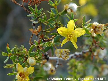 Creosotebush is a native, drought-tolerant, evergreen shrub growing up to 13.2 feet (4 m) tall. Its numerous branches are brittle and densely leafy at the tips. Because of leaf and stem alignment, creosotebush provides little shade during the full desert sunshine.