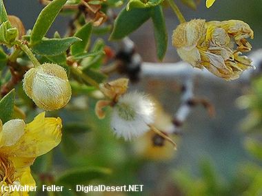 The leaves of creosotebush are thick, resinous, and strongly scented. Flowers are solitary and axillary. Fruits are globose, consisting of five united, indehiscent, one-seeded carpels which may or may not break apart after maturing. Each carpel is densely covered by long trichomes.