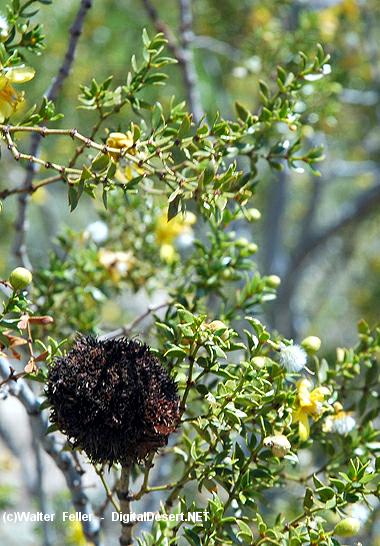 Ball-shaped leafy galls, about the size of walnuts, are common on stems. These galls are caused by a small gnat-like insect known as the creosote gall midge, Asphondylia auripila. The larvae of the midge live in these. The younger galls often appear green and older galls are brown.