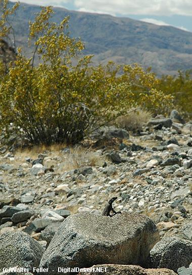 A chuckwalla lizard surveys the creosote landscape from his rock, looking for a mate.