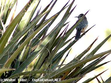 A cactus wren takes refuge in the leaves of a Mojave yucca.