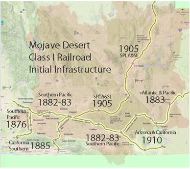 Mojave Desert Historic Railroad TimelineFrom the first cuts through the mountain passes to the last miles of narrow-gauge track laid in the desert heat, the railroads transformed the Mojave Desert. They brought people, supplies, and change—fast. One early observer captured the whirlwind pace:"We witnessed here the fabulous speed with which the Railroad was built... practiced hands dropped the fresh rails one after another on the ties exactly in line... the only limit... was the power of the road behind to bring forward the materials." - The Evolution of the Conservation Movement, 1850-1920 Here's how it all unfolded:Expansion and Local Lines1904 Tonopah & Tidewater 1905 San Pedro, Los Angeles & Salt Lake 1905 Tonopah & Goldfield 1905 Tonopah & Tidewater 1906 Las Vegas & Tonopah 1907 Bullfrog Goldfield 1908(1910?) Arizona & California - Cadiz - Rice - Parker 1912 SP Jawbone 1913 Trona 1915-1916 California Southern (II) Rice - Ripley |