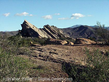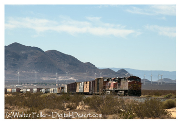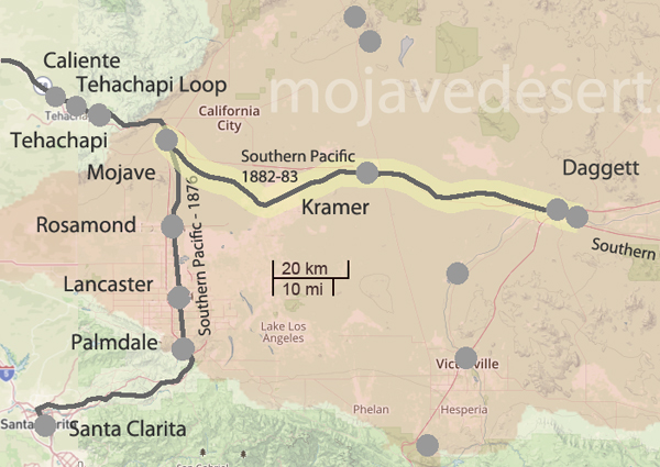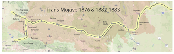 First Trans-Mojave Railroad& 2nd Transcontinental RailroadSan Francisco - Los AngelesIn 1873 the Southern Pacific began building a rail line from San Francisco to Los Angeles. The plan was to build through the length of the central valley, over the very southern end of the Sierra Nevada and directly south through the western end of the Mojave Desert and onward through a canyon to Los Angeles. This would tie in the Los Angeles area to the transcontinental railroad in the north.![]() Trans-Mojave Railroad Tehachapi - Western MojaveThe challenge of the steep Tehachapi Pass was met by the construction of the Tehachapi Loop. The loop allowed the train to pass through an exceptionally steep part of the pass. The line from Tehachapi dropped down into the desert and there made Mojave the center for freight operations in the Mojave Desert.![]() 1876 Communities developed around the waterstops and stations that served the line. Mojave - Daggett![]() Discoveries made further east made it profitable to build from Mojave to Daggett. Daggett - Needles