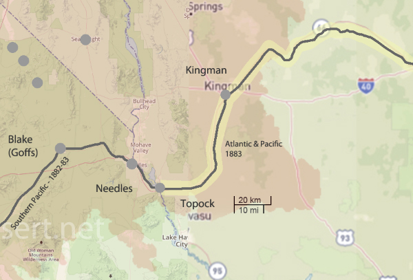 Once construction crews reached Daggett the railroad kept building across the desert to the Colorado River. Kingman - Colorado River![]() While the Southern Pacific was building from Daggett the Atlantic & Pacific had built to Kingman then southwest to Topock and a bridge across the Colorado River. Southern Pacific - Atlantic PacificAfter some negotiation the Southern Pacific line was leased to the A&P and the rail route across the Mojave was complete.![]() |