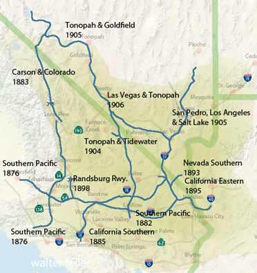 Atlantic & Pacific Railroad Borate & Daggett California Eastern Railroad/Railway California Southern Railway Carson and Colorado Railroad Las Vegas & Tonopah Nevada Southern Railway Randsburg Railway Santa Fe Railroad (Santa Fe Railway) Southern Pacific Railroad Tonopah & Tidewater Railroad Union Pacific Railroad San Pedro, Los Angeles and Salt Lake Railroad Kelso Depot Casa del Desierto Garces Harvey House Railroads around the Mojave National PreserveDefying Death ValleyRailroad Depots, Stations & Eating HousesHistory of Transcontinental Railroading in Arizona, 1878-1949