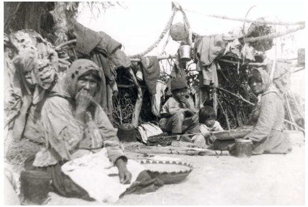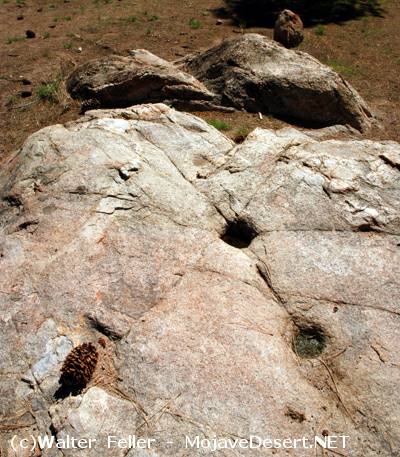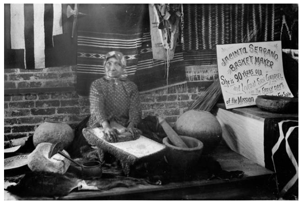 Material Culture, TechnologyThe Serranos acquired the many species of large and small animals available in the area with throwing sticks, various types of traps, nets and snares, arrows, and sinew-backed bows. They also used poison. Baskets were the containers of choice for gathering plant products. These were used not only for transporting the plant products, but also for winnowing, cooking, and storing. Cooking in baskets was carried out by placing hot stones in food held in tightly woven baskets. While the adults and older children were carrying out their various tasks, babies lay or sat in baskets, sometimes carried by the mother, sometimes placed on the ground or a convenient rock. Although one might assume that pottery would have less use than basketry in a desert environment, a considerable number of pottery vessels have been found in the area, showing that pots were used for carrying and storage. Pottery vessels were useful for carrying water, the slight evaporation keeping the remaining water cool. Pottery was often used to cache precious or sacred property in caves when necessary.![]() Serrano basketmaker - C.C. Pierce photo The mortars and pestles, manos and metates, and hammerstones used for pounding, and for grinding food were made by grinding the quartz manzonite and other rocks that were plentiful in most parts of the area. Flaked stone tools served a variety of other purposes. They included fire drills, awls, arrow-straighteners, flint knives, and scrapers. Horn and bone were used for spoons and stirrers. The Serranos kept warm in winter by wearing clothing made of animal hides, and sleeping under woven rabbitskin blankets. For ceremonial events, they used garments made or decorated with feathers, and made rattles made of turtle and tortoise shells, deer-hooves, rattlesnake rattles, and various cocoons. Wood rasps, bone whistles, bull-roarers, and flutes were used to make music to accompany the many songs and dances used in ceremonies. Baskets were not the only thing they wove. Using fibers from yucca, agave, and other plants, they wove bags, storage pouches, cording, mats, and nets (Drucker 1937; Bean 1962-1972; Bean and Smith 1978). ![]() Most Serrano houses were circular domes that had a central fire pit. The homes of several families tended to be clustered in small settlements, and included not only the houses, but also basketry granaries for storage of food, sweathouses, and often a ceremonial house. They were placed near springs or other water sources, and as near as possible to other resources (Bean and Smith 1978). << Previous << Contents >> Next >> |