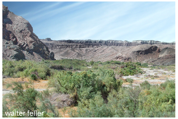 ![]() Ancient Lake Manix shoreline Anthropologists and archeologists theorize that the first wandering Asians, crossing over via the Bering Straits, came this way and in successive migrations moved inland from the sea here, settled along its shores and then spread across North America, becoming the first American Indians. As the Ice Age ended and the climate became harsher, man moved farther away, leaving the shrinking lake to fewer and smaller groups of Indians. Native American legends indicate that a volcanic explosion ruptured a ridge holding the lake and in a single night the waters rushed through a flood widen gorge leaving behind only marshes that fed the Mojave River. The resulting "Grand Canyon of the Mojave", is today called Afton Canyon and is the only "natural" surface drainage leaving Mojave River Watershed. ![]() Afton Canyon Later, after the strange disappearance of Manix Lake, the fierce Shoshonean Paiutes moved into the area, adapted to it and pushed out the remainder of the earlier inhabitants whose only memorials are a few primitive tools and weapons found near ancient campsites, and mysterious petroglyphs carved into desert boulders and cliffs. The Paiute's themselves later became victims of the desert: limited in numbers and body size because of the dwindling game and food supplies, forced to wander in small groups from water hole to water hole, they had little defense against the marauding parties of Mohave coming west from the Colorado River and slave-hunting Apaches from the southwest. The Serrano who lived in the forested mountains, the Vanyume along the Mojave River, the Chemehuevi who lived between them and all of their enemies in turn would be displaced by another race of men who first marched into the great Mojave Desert in 1542. Only fifty years after Columbus landed in the New World, a scouting party of Spaniards attached to the Coronado expedition crossed the Colorado River. After four days in the desert they returned to report the sighting of snow-clad ranges in the West ... the same mountains once crossed by prehistoric man to reach the great lake that disappeared in the night. On September 28, in the same year, Juan Rodriguez Cabrillo stepped ashore on the far side of those mountains to claim all of California for their Catholic Majesties, the rulers of Spain, the West Indies, and most of the Western Hemisphere. ![]() Cajon Pass Life in the vast Mojave Desert remained little changed for another 230 years. Except for the industrious traders of the Mohave Indian tribes along the Colorado River and nomadic Northern Piaute and Ute, the area was unknown, and unexplored by outsiders. Within three years after the founding of Mission San Diego by Fra Junipero Serra and Gaspar de Portola in 1769, the first Spanish probe across Cajon Pass from the coast arrived, led by Lt. Pedro Fages. Military commander and Governor General of New Spain's remotest province, he proceeded along the northern flank of a mountain range (modern Phelan) across to a valley covered in a thick forest of tall, forked Yucca inhabited by antelope and elk on his way to California's large central valley in search of runaways from Mission San Gabriel, founded the year prior and destined to become richest of the self-sustaining religious communities. Fages' discovery of a low but steep pass at the end of a box canyon (in Spanish called a "canun cajon" and a marshy tule lined valley on the western headwaters of a northward flowing river, was important to the success of the mission system. During this period of Spanish influence, the missions were still dependent for many of their supplies from beyond the borders of Alta California. The following year Juan Bautista de Anza opened the Santa Fe Trail across the desert from the earlier missions of Arizona and Sonora, and in 1776, Fra Francisco Garces led a party up the Colorado to a tall rocky " needle-like" outcrop and thence across the desert to the headwaters of a northward flowing river. ![]() The Needles Fra Francisco Garces' westward travels took him to a low "pass" between two mountain ranges near the headwaters of a river that flowed out into the desert. It was here that Garces baptized the watershed's first Christians from the Vanyume and Serrano tribes that lived near the river's eastern and western forks. Later, returning from the "great central valley" to the southwest, Fra Graces retraced his earlier route eastward about 40 miles below the "lower narrows" of the desert river, following a Mojave Indian trading route treading together a handful of desert oases. The existence of water in the river, either running on the surface or lying just underground, had made this a natural route for Indians over the centuries. The happy coincidence of the location of a Cajon pass near its sources contributed to the importance of this trail. As life became easier at the missions, the handfuls of soldiers quartered there found time to explore further in the new lands surrounding them, locating other Indian bands for conversion by the padres and as always, searching for gold. Evidence of Spanish mining activities dating from this period has been found in the Lucerne Valley to the East, and Arrastre Canyon takes its name from a Spanish ore crusher found there. That they were limited to minor operations may be attributable to the ferocity of the Mojave and other Indians of the desert. Although pack trains with supplies for the missions of Alta California traveled the desert annually, they and any smaller parties were subject to harassment by these tribes. Between the major Spanish settlements of Northern Mexico and Arizona... Caborca, Alamos and Tubac... stood tribal lands of the Apache, Pima, Yuma, and Mojave. The latter were especially troublesome, being responsible for the deaths in 1819 of seven neophytes sent to establish an asistancia, or branch mission, by the padres of San Gabriel along the headwaters of the Mojave River. After Mexico achieved indepe