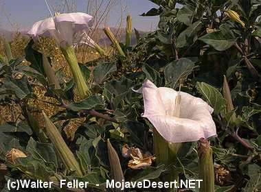 Desert WashDeath Valley WildflowersMicrohabitatIndian Culture CeremonialismWildflower Photo GuideJoshua Tree National ParkList of Mojave Desert Shrubs *Plants at Hoover DamZion Wildflower List *Plants of the Grand Canyon *Mojave Desert Annuals *Sacred DaturaDatura wrightiiFlowers are large, showy and erect to nodding. Found in dry open and sandy places to 4000', creosote bush scrub and joshua tree woodlands. Blooms May to October Highly toxic - can be deadlys.